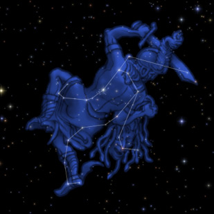 星座絵をよく見てください。ペルセウス王子。剣を振り上げ、腰のあたりに何か持っています。王子が退治した怪物メドゥーサの首です。メドゥーサの首のところ、明るく輝いている星は「アルゴル」という名前でおよそ3日ごとに明るくなったり暗くなったりする不思議な星です。